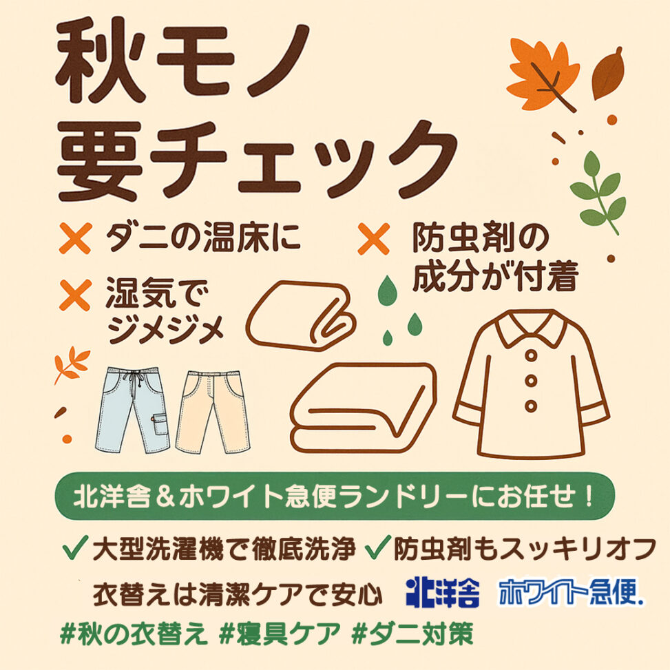 北洋舎&ホワイト急便ランドリーの大型マシンで、洗う→乾かすまで屋内完結。清潔リセットで気持ちよく秋を迎えましょう。